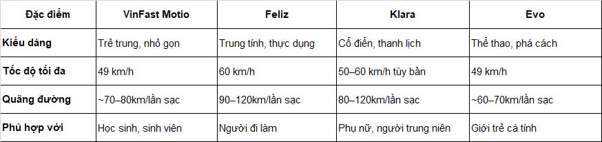 VinFast Motio là mẫu xe điện hướng đến đối tượng người dùng trẻ trung, năng động với thiết kế tối giản nhưng không kém phần cá tính. Dưới đây là so sánh nhanh giữa Motio và các dòng xe điện khác của VinFast: